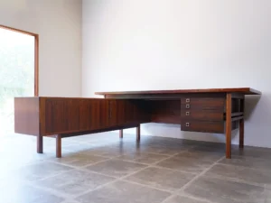 ローズウッド材を贅沢に使ったモデルでは、天板の縁や脚の接合部の処理が美しく、機能性と彫刻的な存在感を兼ね備えたワークファニチャーとしてコレクターに人気があります。 -