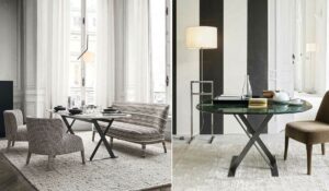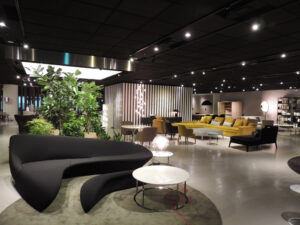 B&B Italiaがよりモダン・建築的・実験的な家具で知られるのに対し、Maxaltoは「クラシックとモダンの中間/ネオクラシック」を担う姉妹ブランドとして差別化されています。 同じショールーム内でも、B&Bは白やグレーを基調としたモダン空間、Maxaltoはブラウンやトープ、ブロンズを基調とした落ち着いた空間というように、世界観が分けて展示されることが多いです。