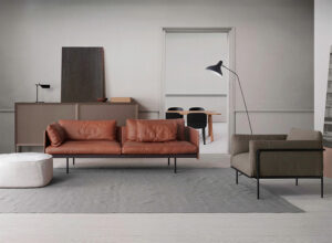 フレームにはニュージーランド産パイン、北欧産ビーチ無垢材、アメリカ産オークやウォールナットが使用され、外枠部分はすべてサスティナブル認証材を採用。張地には厳選された柔らかなヨーロッパレザーやファブリックを使い、アニリン仕上げされたレザーソファは自然な質感と深みを追求。