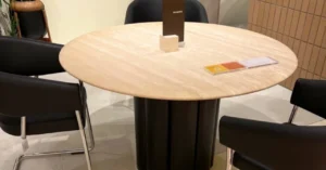 PIVOT(ピヴォット):無垢材の円柱と大理石天板の組み合わせによるリビングテーブル。機能性と彫刻的美しさが共存します。