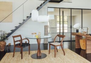 ガラストップ+木フレームなど、抜け感を作りながら木の造形を見せるプロポーションが多く、狭い空間でも重たく見えにくいのが利点です。